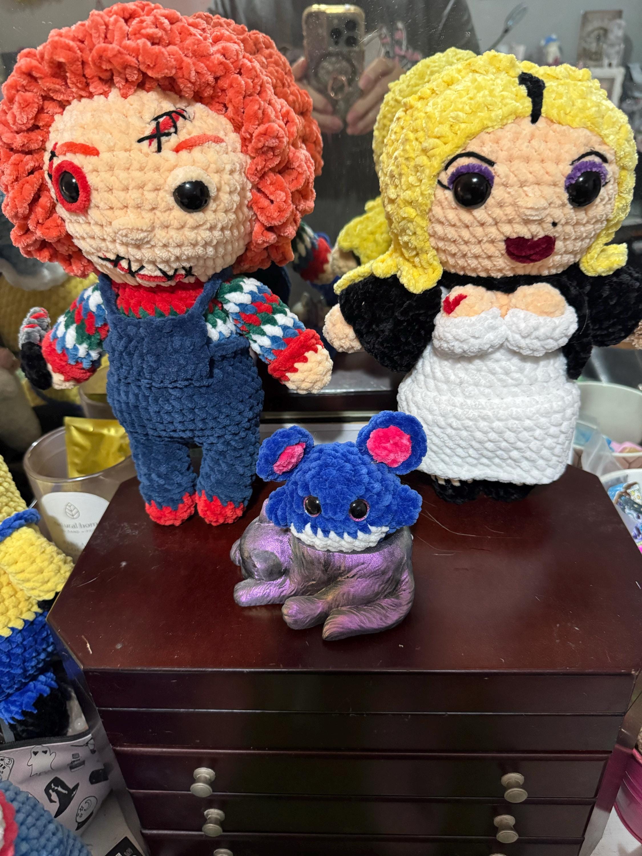 • The finished plushies both measure between 10 and 10 1/2 inches tall (depending on yarn used).
